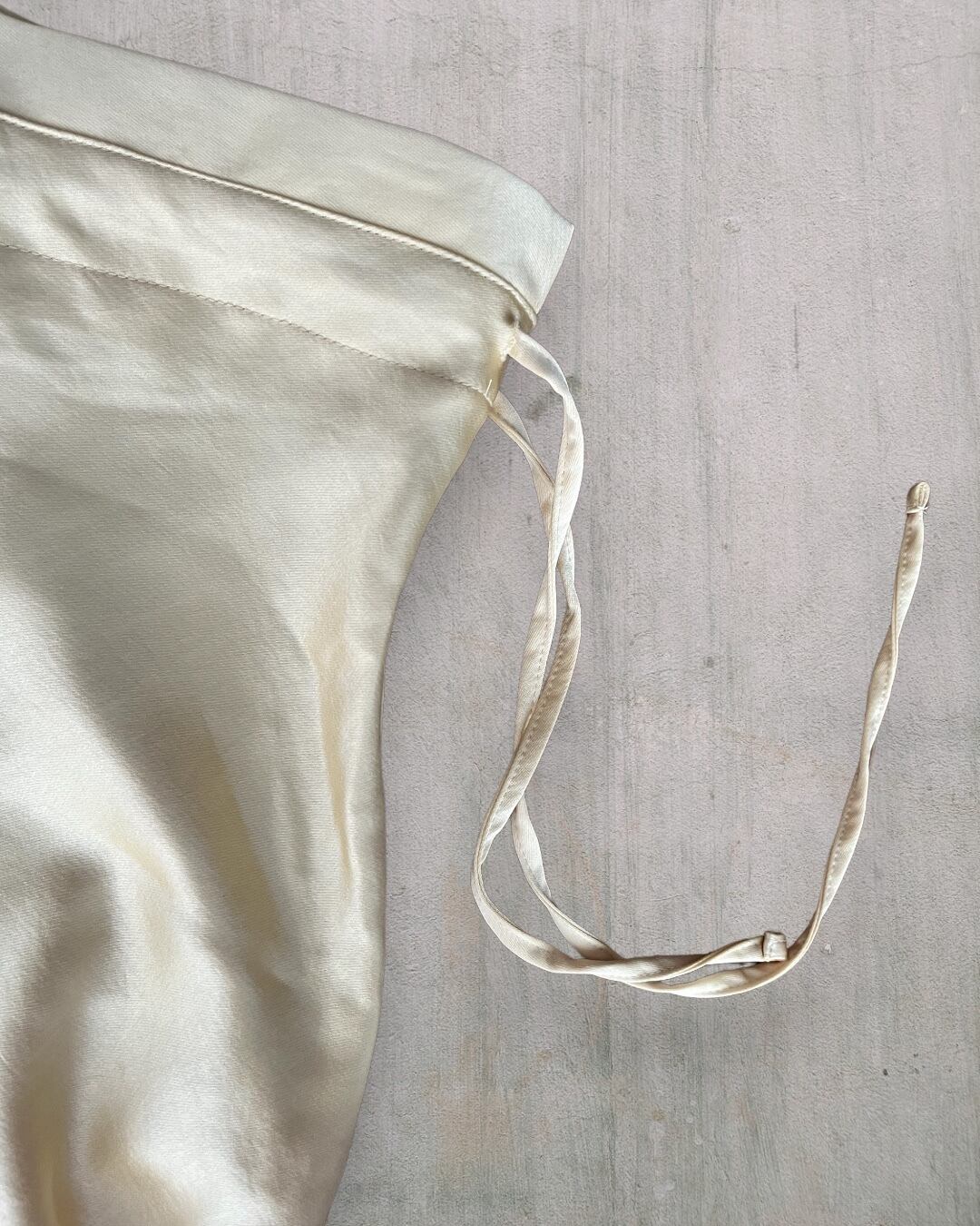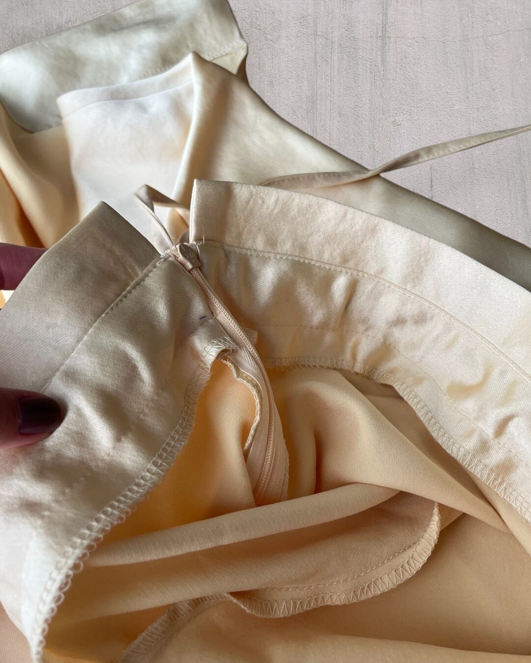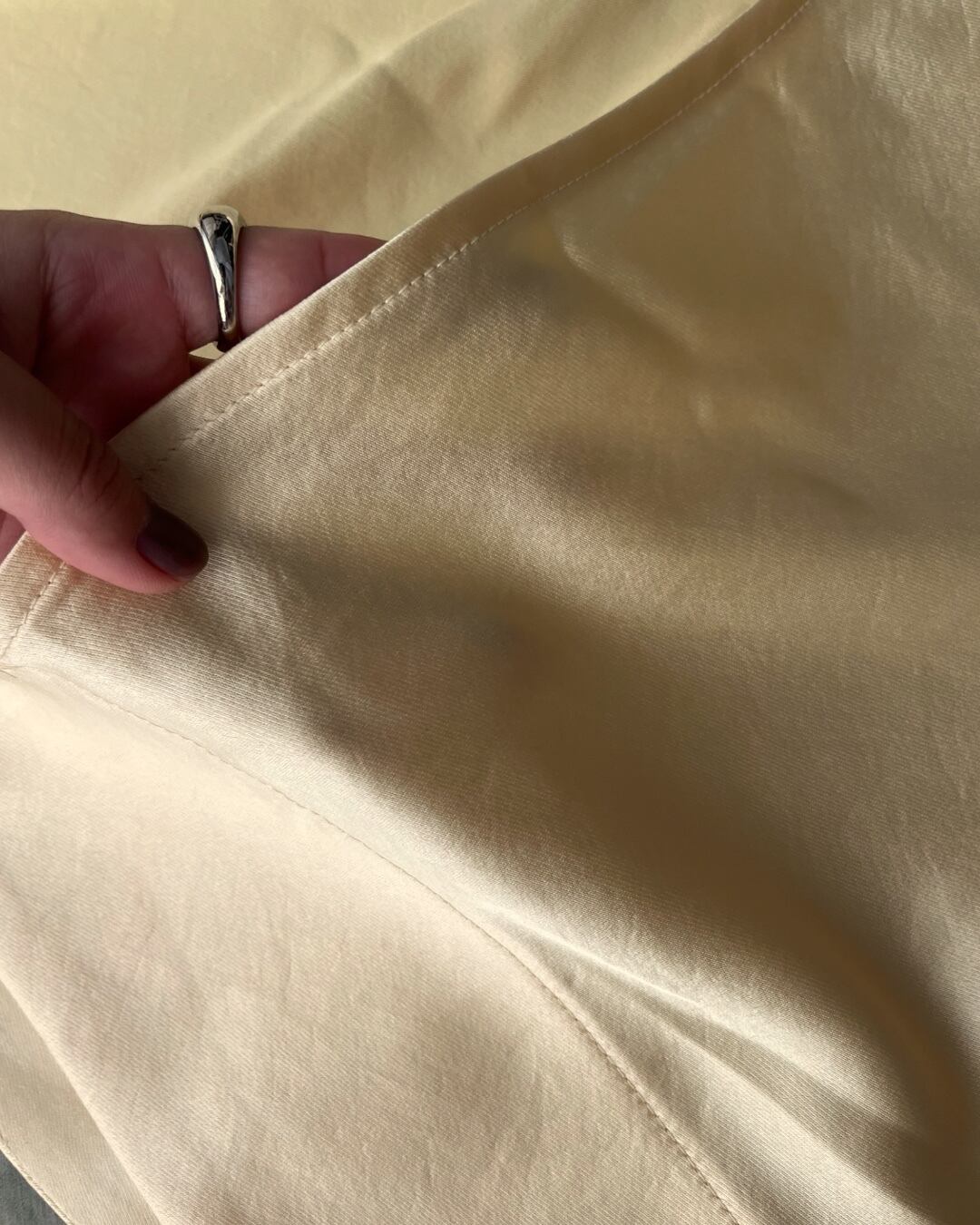 ツヤ感のある生地と腰のラップ風のデザインでシンプルながら目を引く印象に。