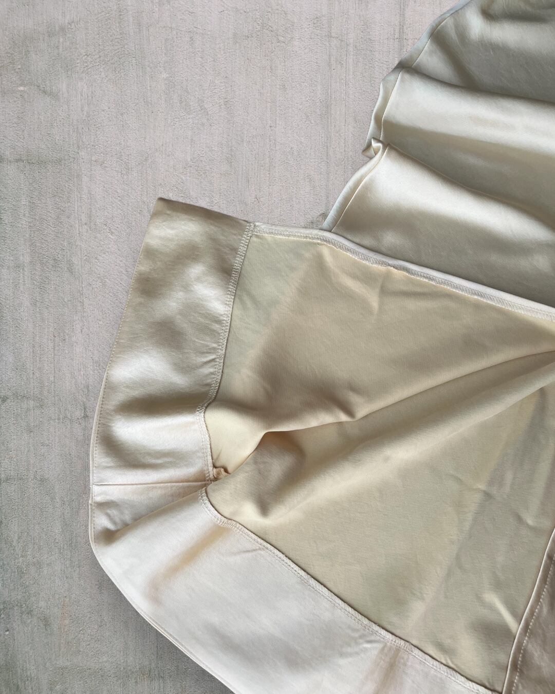 腰にデザインのあるスカートですが、柔らかい生地なので、タイトなもの以外はトップスをアウトしても腰回りそこまでごわつくことなく着用いただけます。